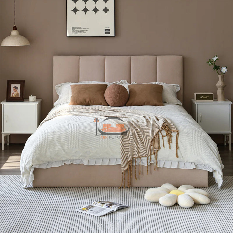 Alfie Bed Frame boasts a contemporary design and a soft fabric cover. Its headboard features a smooth panel design, which makes the bed look neat and contemporary. Its clean design is compatible with most bedroom designs. The cushioned surface and soft corners add warmth and coziness to the room, exuding a feeling of relaxation and neatness.