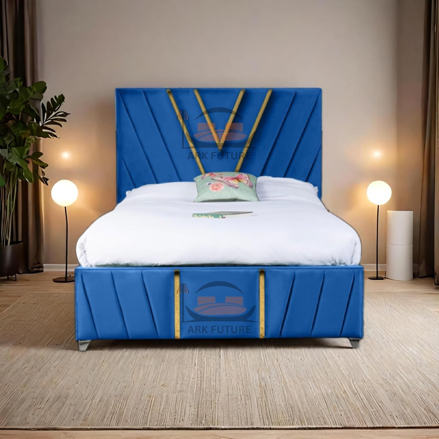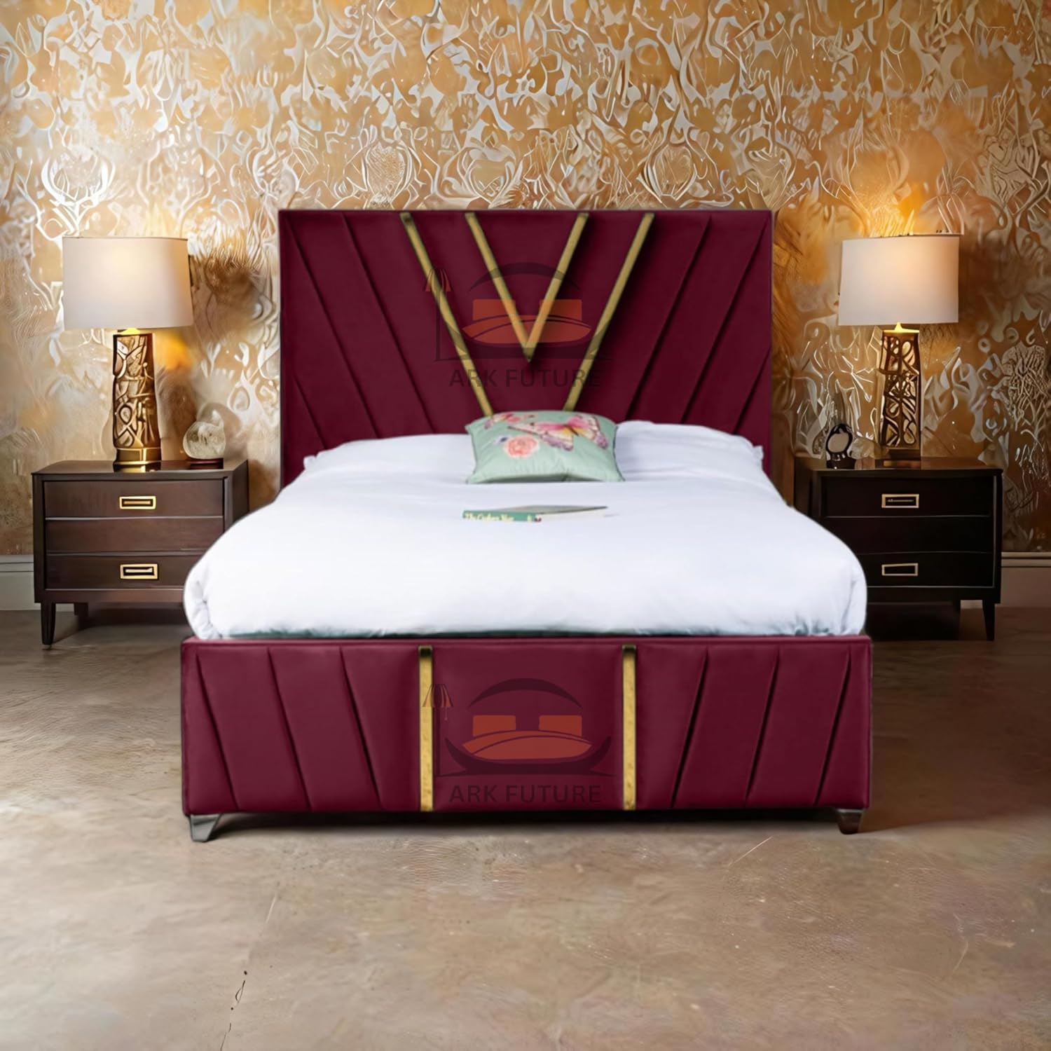 Add a touch of glamour to your bedroom with the Midnight Mirage Plush Velvet Bed Frame. The stunning gold trim and intricate pattern design create a striking focal point, elevating your space with elegance. The soft velvet upholstery offers comfort, while the sleek chrome legs provide modern style and durability. Available in king and queen sizes, this bed frame blends luxury and sophistication for a truly refined bedroom.
