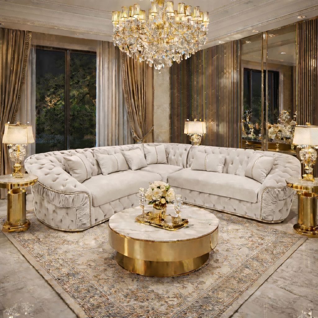 Introduce luminous glamour to your home with the exquisite Slate Rib Corner Sofa. Upholstered in a radiant, pale plush velvet, this piece instantly brightens any living space. The design is framed by luxurious gold-tone piping that traces the elegant, scrolled arms and base, giving it a high-end, bespoke finish. Deep button tufting across the sides and back adds rich texture and a classic foundation. The sweeping L-shaped configuration offers generous, sink-in seating. Choose the Slate Rib to infuse your room with soft color, magnificent detailing, and enduring, comfortable style.